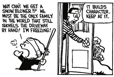 Once, Calvin wonders why his parents can't buy a snow blower, instead forcing him to shovel by hand, and yells to his dad from outside. He comes out the door and tells him that it builds character and to keep at it. Calvin remarks that it's "Pretty convenient how every time he builds character, Dad saves a couple hundred dollars."