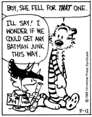 Calvin ponders if he could trick his mother into buying him some "Batman junk." (August 12, 1989)