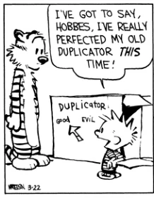 The Duplicator has only been used twice. The first time it was used, Calvin made a duplicate of himself to clean his room while he went outside. The duplicate objected, and went to play outside. After the duplicate left, Hobbes remarked, "He's a duplicate of you, all right," to which Calvin replied, "What do you mean? This guy is a total jerk!"