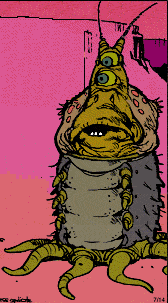 The featured Gurl appeared as a very large, greenish-brown, tentacled being with a vertically stacked pair of eyes. Its body is stout with a large, antennae-laden head akin to a rotting prune. It does not appear hostile, as it did not try to act against Spiff even though he came provokingly close.