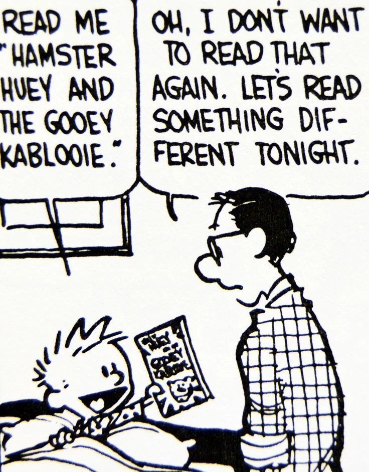 In another, Calvin's father made up a new story with the same characters, in order to avoid having to read the same story again. However, this new adaption was not exactly appropriate for young children like Calvin.