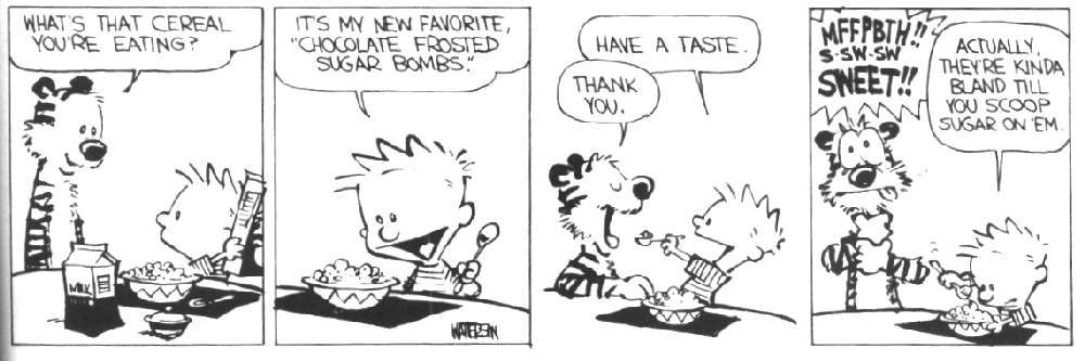Hobbes does not like Calvin's cereal, "Chocolate Frosted Sugar Bombs", for he says that it makes his heart skip. He would rather eat toast for breakfast.