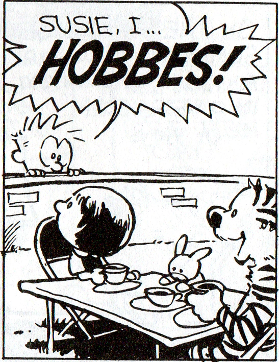 There has been more than one instance of Hobbes appearing the way Calvin sees him around another person. One instance is when Calvin loses Hobbes in the first Calvin and Hobbes book, Hobbes is seen as a tiger in the company of Susie Derkins. However, she was facing the other way when it occurred (see picture on right). In a Sunday strip from the same book, the car stops going and Calvin and Hobbes beep the horn hoping for someone to come help. Hobbes is seen as a tiger when Calvin's mother is there, but she isn't looking. There is one strip when Calvin is fighting with Hobbes' and we see Susie's perspective in one panel, but some people think it was Calvin seeing him transform back into his stuffed animal form and expressing confusion.