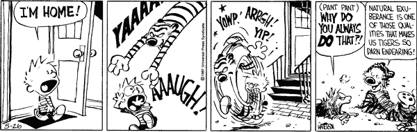 Hobbes always likes to surprise Calvin while Calvin says "I'm Home!" and Hobbes does his famous pounce.