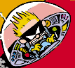 front (back and front are here relative to the pilot's orientation). As Bill Watterson's drawing style evolved, so too did the appearance of the Saucer change somewhat; the hull became a softer hue of red, and the metal plates that make it up are less visible. The Saucer also seems somewhat larger in its later appearances.