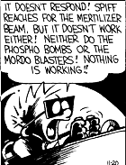 The Saucer features a vast and exotically named, if hardly functional weaponry array. The main weapon seems to be the computer-guided "Death Ray", fired from the ship's Blaster, which delivers a destructive electric charge (it was once calibrated at a gazillion volts). Other weaponry include a "Mertilizer Beam", "Phospho Bombs", "Hydro Bombs", a "Frap-Ray Blaster", "Mordo Blasters" and a "Fizzler" (may not be a weapon). Some of these weapons or variants of them are used by Spaceman Spiff on the ground, or by his enemies in space. At one point, Spiff experiences a complete failure of the weapons system, seemingly very fragile and poorly designed.